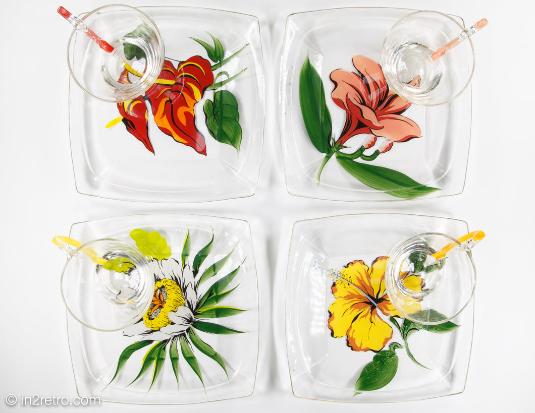 VINTAGE SET OF FOUR HAND-PAINTED FLORAL GLASS DESSERT PLATES WITH MATCHING CUPS | 8 PIECES