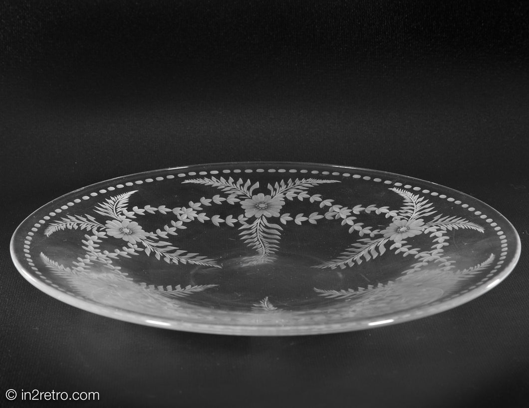 ROUND CLEAR GLASS PLATE WITH ETCHED FLOWERS AND LEAVES WITH DOTTED RIM DETAIL