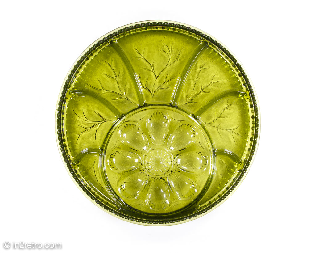 VINTAGE AVOCADO GREEN GLASS DEVILED EGG DIVIDED SERVING PLATTER BY INDIANA GLASS CO.