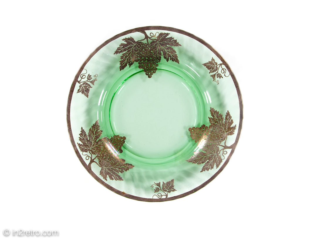 RARE VINTAGE GREEN GLASS WITH SILVER OVERLAY DESSERT PLATE WITH GRAPES & LEAVES MOTIF